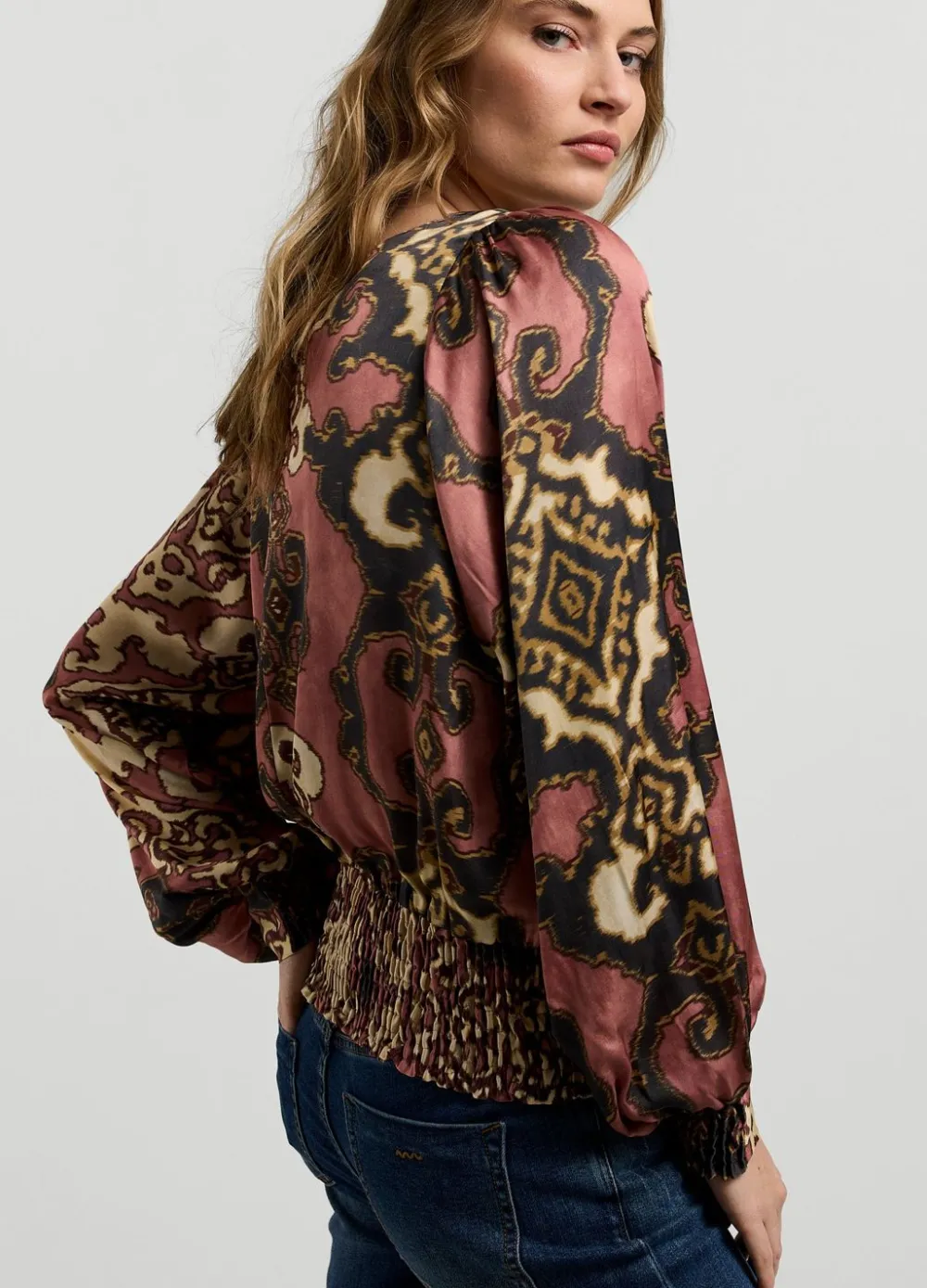 Top Met Ronde Hals En Splitje In De Nek Gemaakt Van Een Licht Glanzende, Bedrukte Stof. De Top Heeft Pofmouwen Met Gedeeltelijk Gesmokte Manchetten.