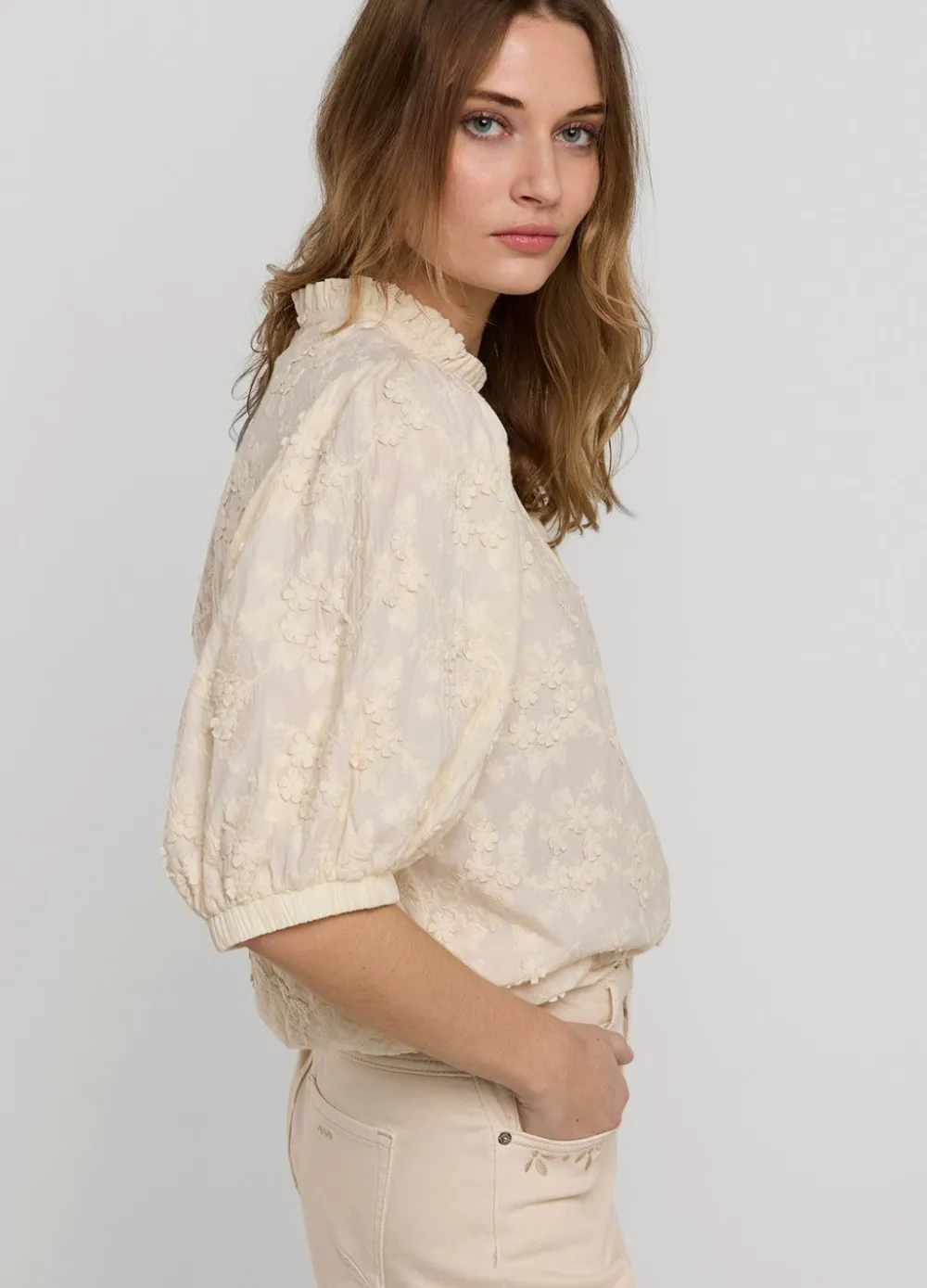 Blouse Van Comfortabel Katoen Met Opgelegde Bloemen. De Blouse Heeft Korte Ballonmouwen Met Elastiek En Een Ronde Hals Met Split En Knoopsluiting
